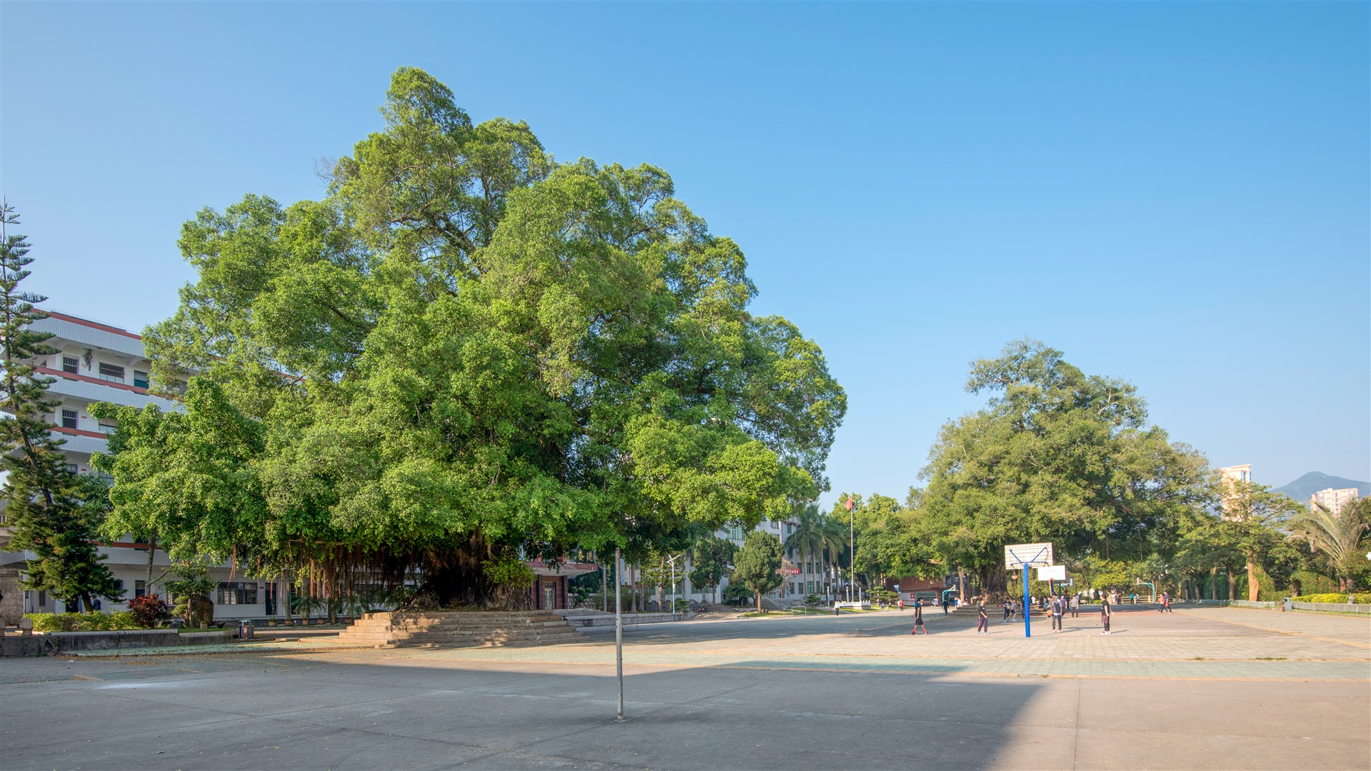 进校门,一排排自行车停放得井然有序。沿着石阶走到中操场,两棵古榕树苍翠欲滴、枝繁叶茂。即使严寒酷暑,它仍然屹立挺拔,为学生遮阳挡雨。除了两棵生机勃勃的大树,还有各种鲜花绿草,构成一幅校园美景。
