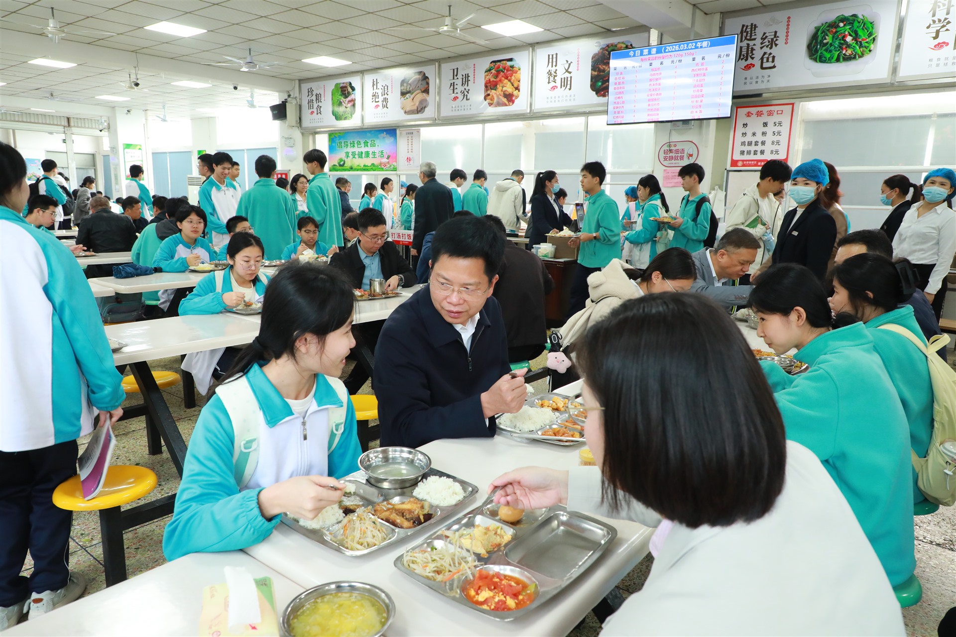 蓝良木与师生共进午餐,倾听他们对饭菜口味、种类和分量的评价和意见